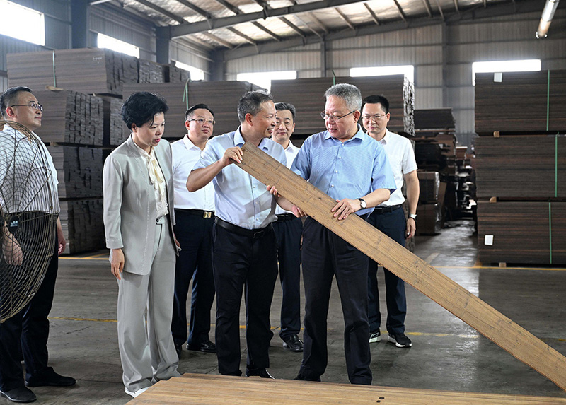 2025年6月16日,省政協副主席虢正貴來湖南桃花江竹材科技股份有限公司調研生態(tài)資源轉化與特色產業(yè)融合發(fā)展。公司董事長、省人大代表薛志成陪同并介紹情況。虢正貴充分肯定了桃花江竹材在竹資源利用及竹特色產業(yè)融合發(fā)展所取得的成果,他鼓勵企業(yè)繼續(xù)發(fā)揮龍頭優(yōu)勢,充分利用好桃江資源稟賦和產業(yè)優(yōu)勢,深化產學研融合,提升竹產業(yè)附加值,為民族地區(qū)生態(tài)資源高效轉化和特色產業(yè)融合發(fā)展探索更多經驗。